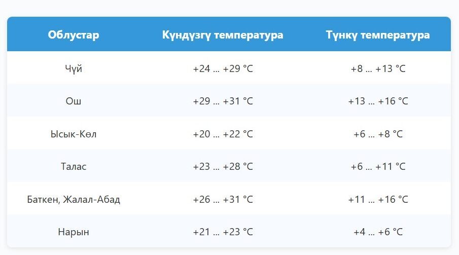 Баткен жана Жалал-Абад облустарында күндүзү: +26…+31°, түнкүсүн: +11…+16°;