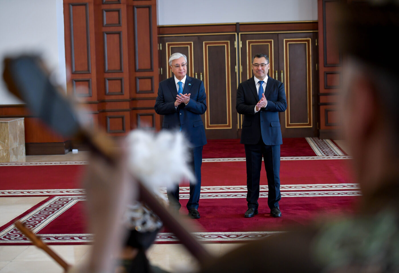 Казакстан лидеринин кортежи “Ынтымак Ордо” имаратына келген соң, мейманды президент Садыр Жапаров тосуп алды. Имараттын алдында эки өлкөнүн мамлекеттик желектери илинип, ардак кароол тизилди. Президенттер саламдашкандан кийин Кыргызстан менен Казакстандын мамлекеттик гимндери жаңырып, мамлекет башчылары кароолду кыдырып чыгышты.