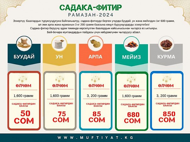 Буудайдан сырткары ун (1 кг 600 грамм), мейиз (1 кг 600 грамм), арпа (3 кг 200 грамм), курма (3 кг 200 грамм) менен берсе болот. Базар баасы менен алганда мейиз – 680 сом, ун – 75 сом, арпа 85 сом болсо, курманын баасы 850 сомду түздү.