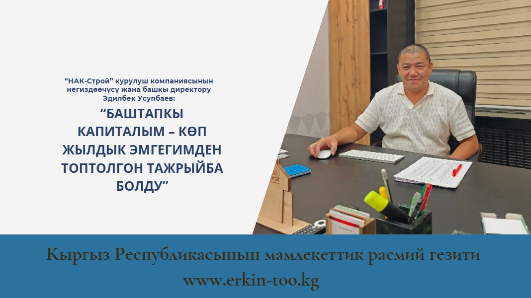 “НАК-Строй” ишканасы өлкөдөгү ири салык төлөөчү компаниялардын катарына кирип, мамлекеттин казынасына олуттуу салым кошууда. Ошол эле учурда көптөгөн курулуш долбоорлорун ийгиликтүү ишке ашырып, элге керектүү шарттарды түзүп берүүдө. Бүгүнкү маегибизде Эдилбек Усупбаевдин ишкердикке болгон көз карашы, башынан өткөргөн сыноолору жана ийгиликтүү жолунун сырлары жөнүндө сөз кылабыз.