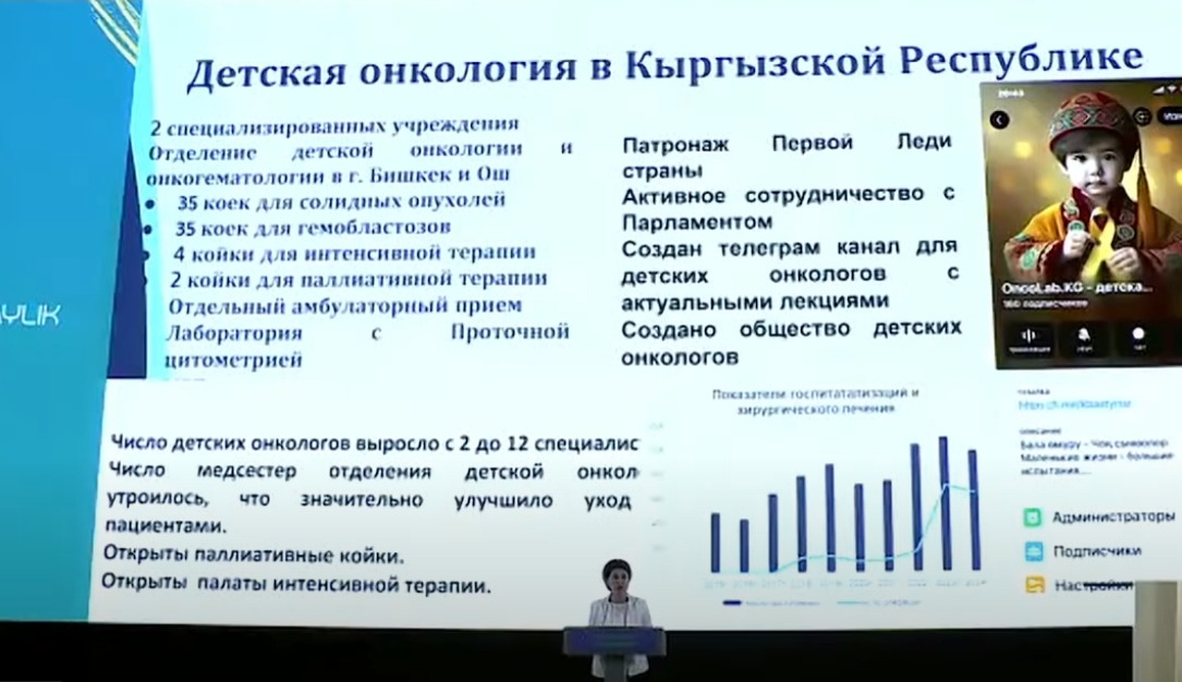 «Балдар үчүн диалог: Борбор Азия жана ЮНИСЕФ» форумунда Кыргызстандын Саламаттык сактоо министринин кеңешчиси Эльнура Боронбаева балдар онкологиясы жаатындагы ийгиликтер тууралуу маалымат берди.
