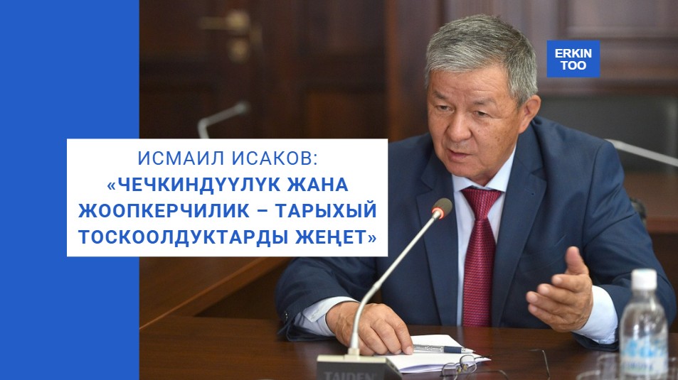 — Кыргызстан жаңы баскычка кадам таштамак турсун, жаңы баскычтын босогосун аттап өтүп, жолдогу тоскоолдуктардын таш-талканын чыгарып бузуп, каршы чыккандарды асфальт алдына төшөп, бардык тармакка митедей кирип, каалаган жерге үйлөрүн, имараттарын салып алгандарды санитарлар курттардан тазалагандай тазалап, эки жакка алаксыбай алдыга карай кетип жаткан учурубуз. Буга Президент Садыр Жапаровдун ишениминин жана колдоосунун негизинде Оштун мэри Жеңишбек Токторбаевдин иш-аракеттерин мисал катары айтсак болот. Мурун ушундай баскычтагы кадамдар болду беле? Албетте болгон эмес. Кадам эмес, кээ бир көйгөйлүү маселелерди чечүү үчүн «объектилерге» басып бармак тургай ал жерге мурдубузду тыгуудан коркуп жүргөнбүз. Бул жаңы баскычтын нак далили.