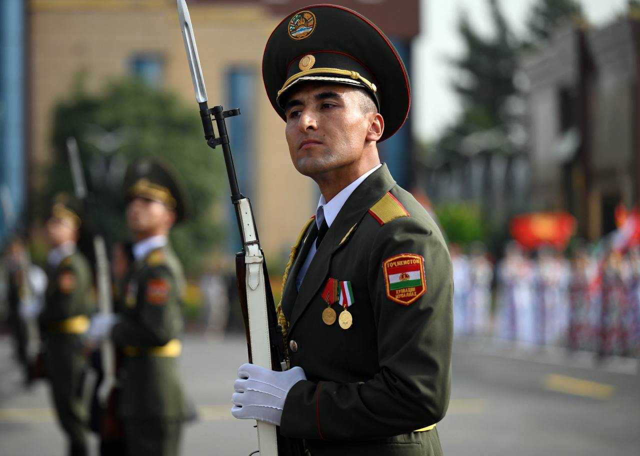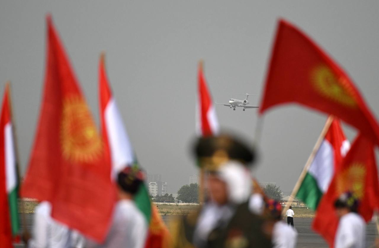 Душанбе шаарынын эл аралык аэропортунда эки өлкөнүн мамлекеттик туулары илинип, килем төшөлүп, ардак кароол тизилди.
