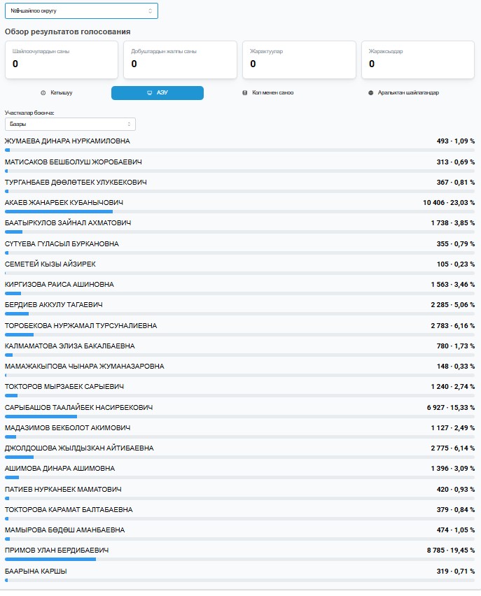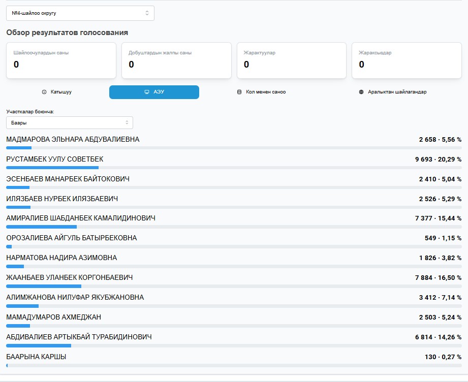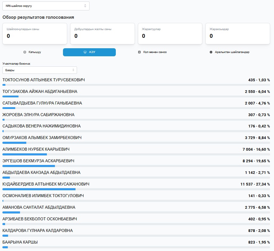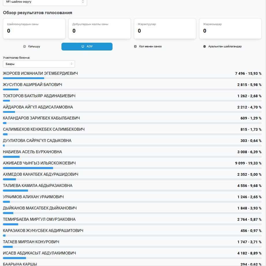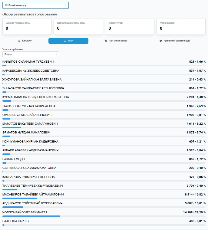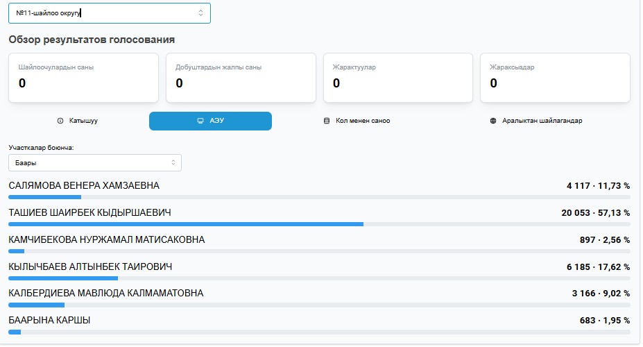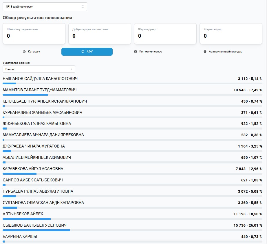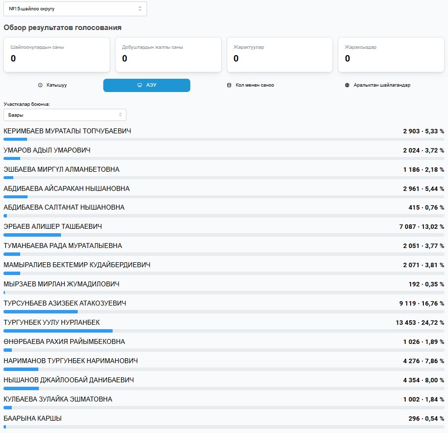 Шайлоодо кайсы талапкер канча добуш алды? (№1 округдан №15 округга чейин учурдагы көрсөткүч)