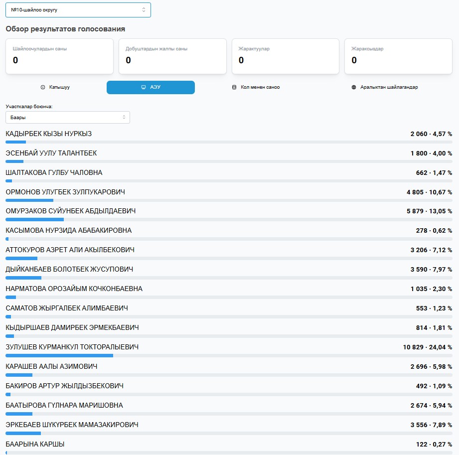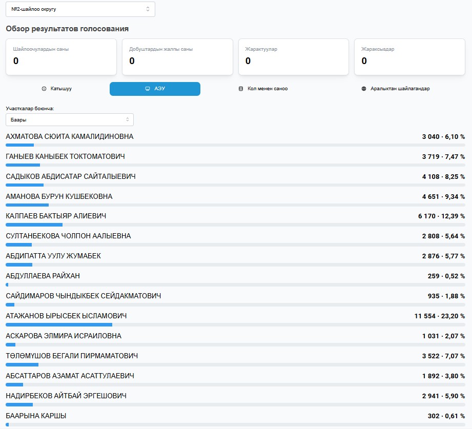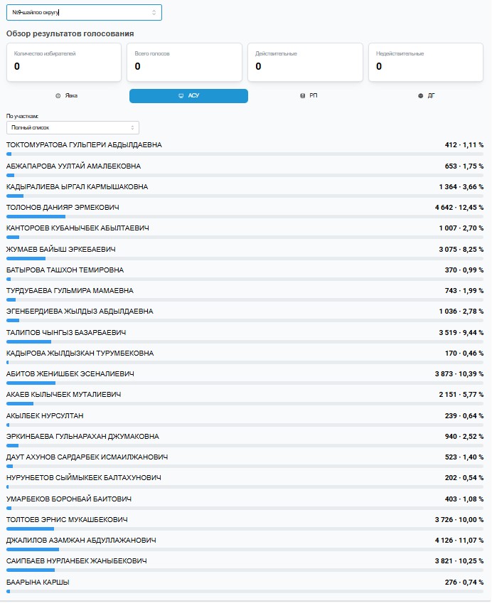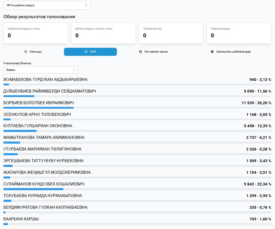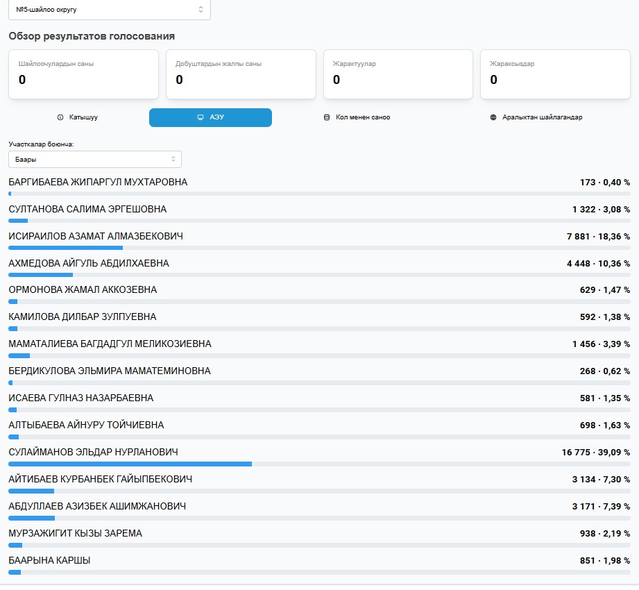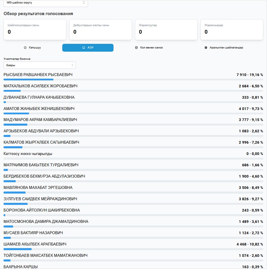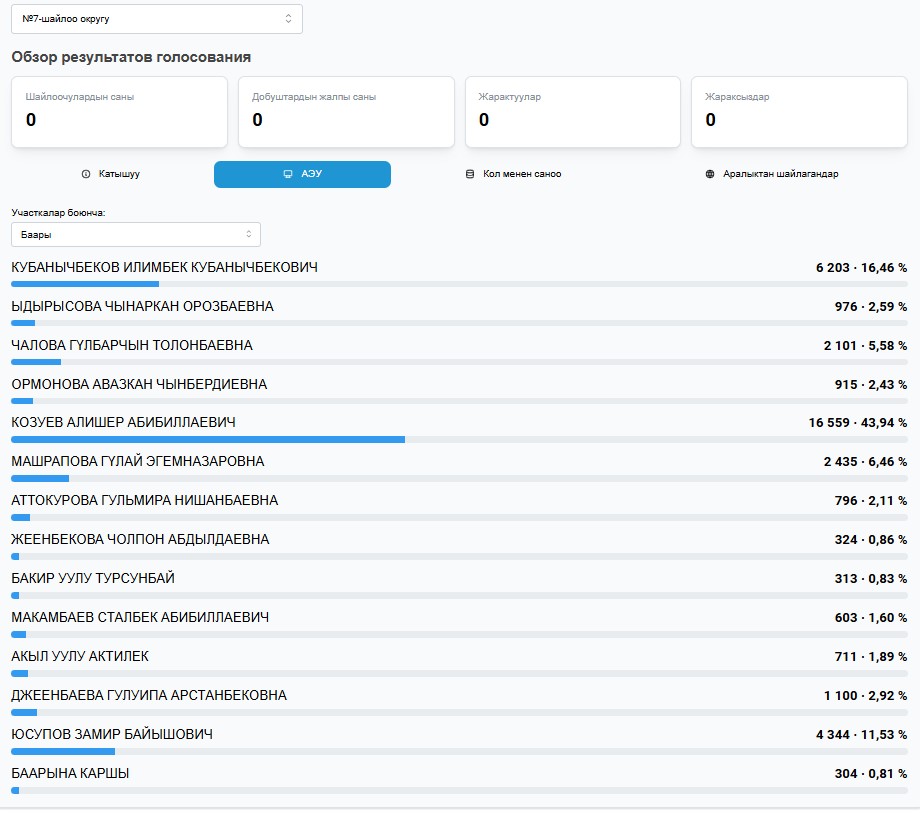 Шайлоодо кайсы талапкер канча добуш алды? (№1 округдан №15 округга чейин учурдагы көрсөткүч)