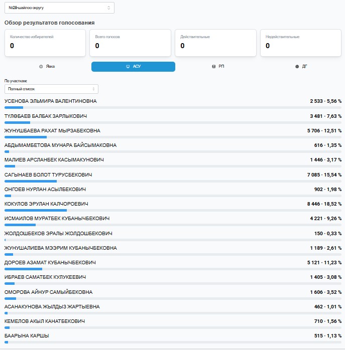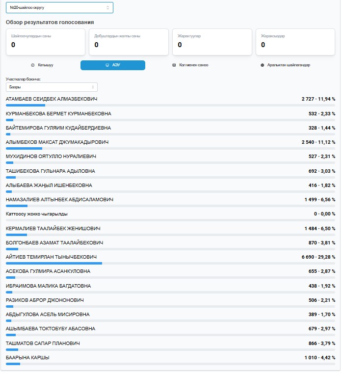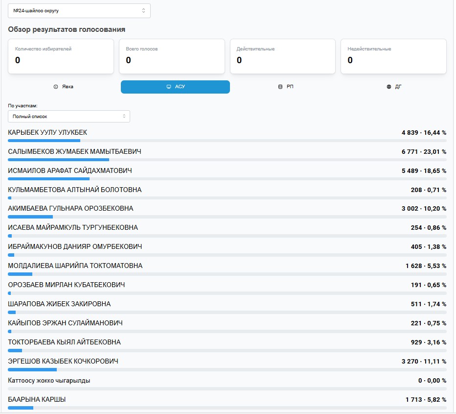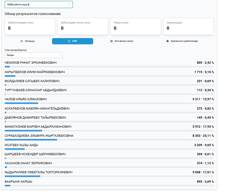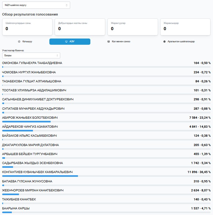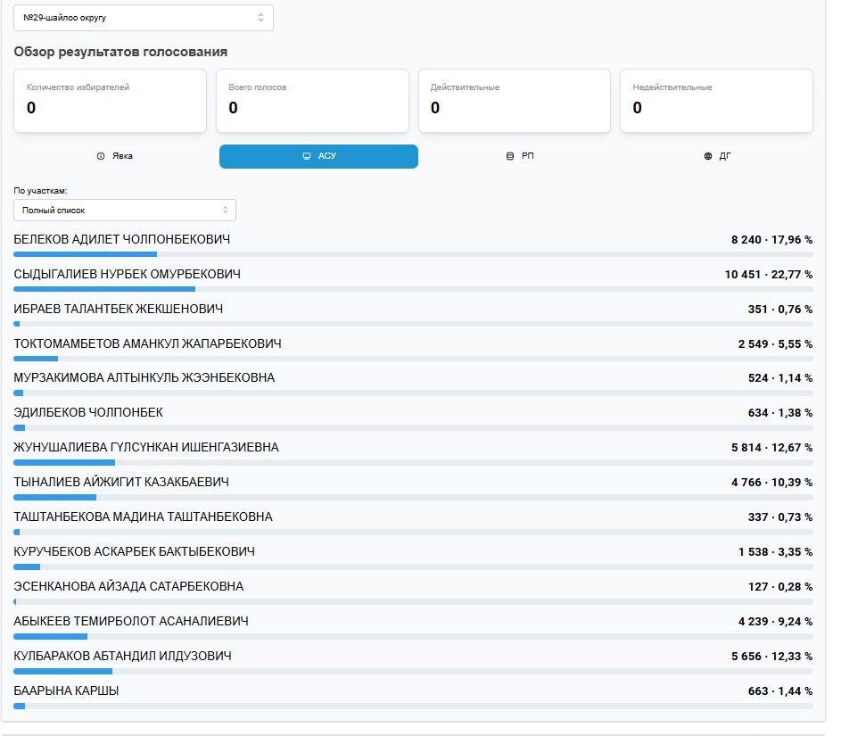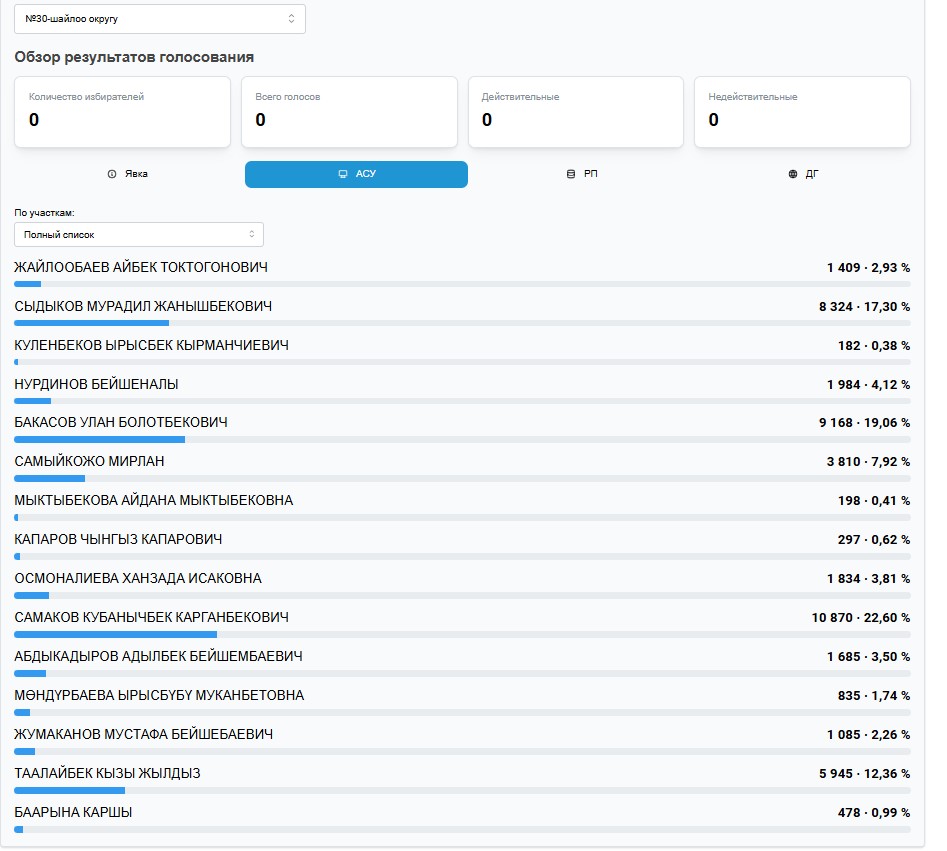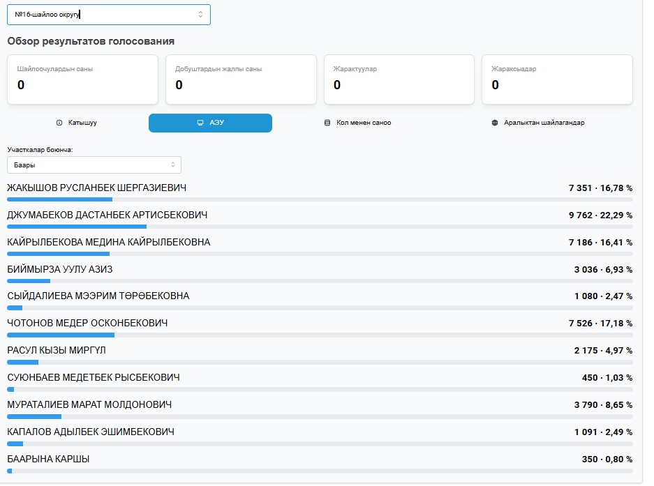 Шайлоодо кайсы талапкер канча добуш алды? (№16 округдан №30 округга чейин учурдагы көрсөткүч)