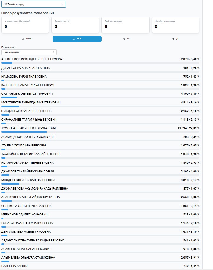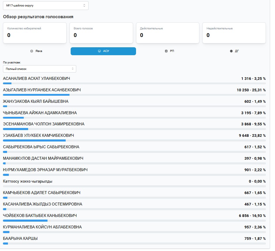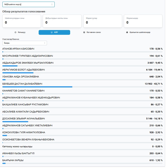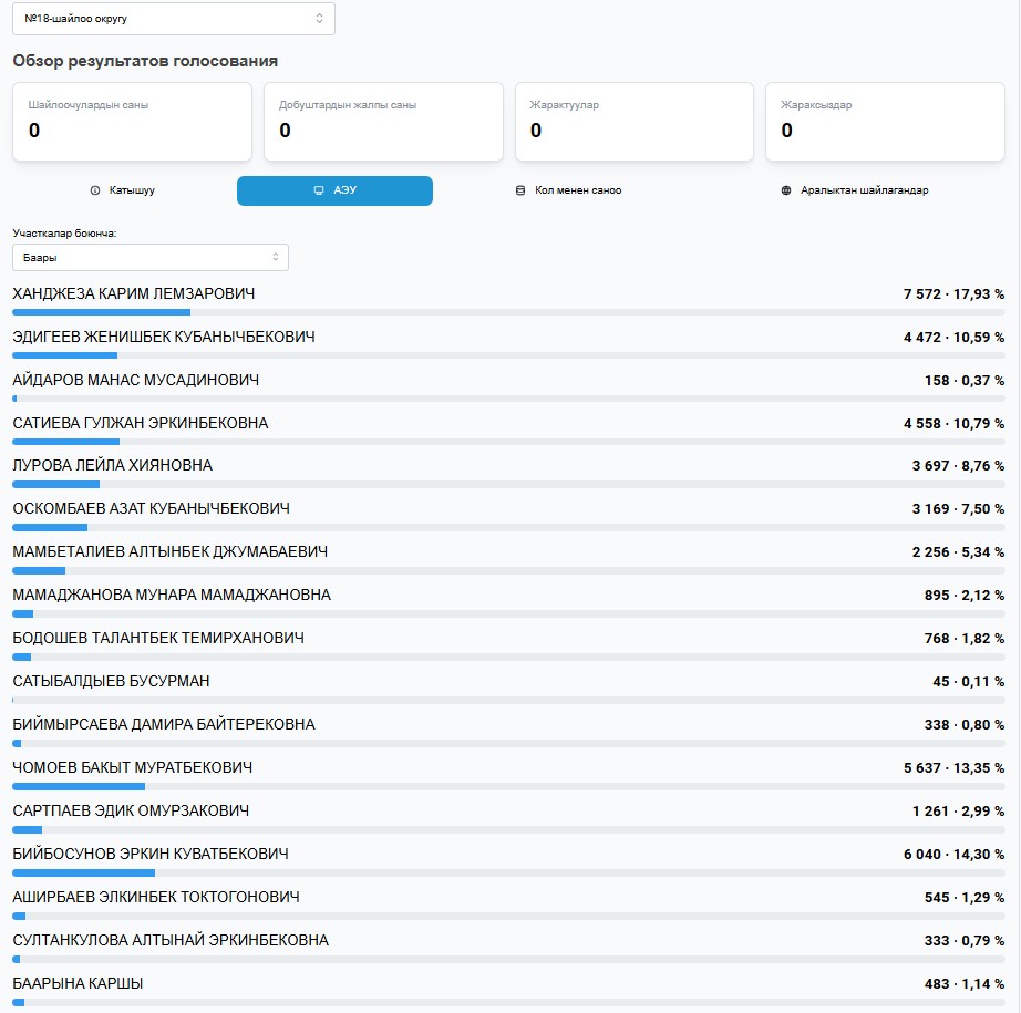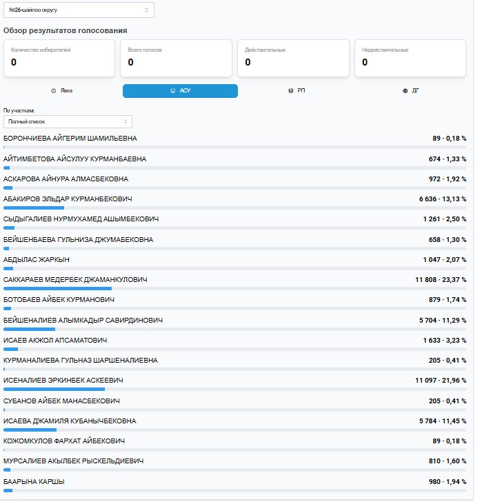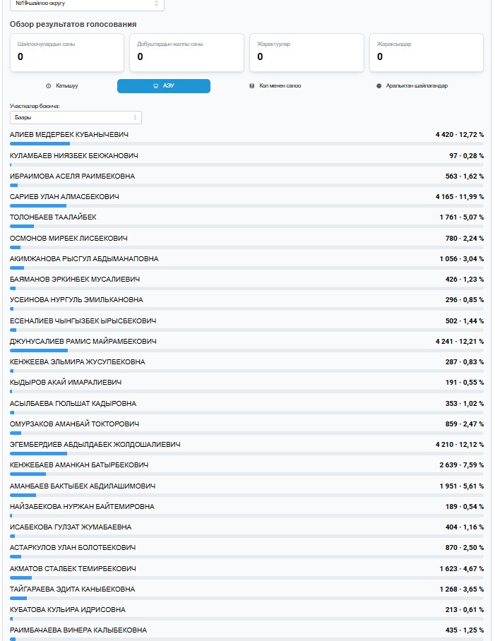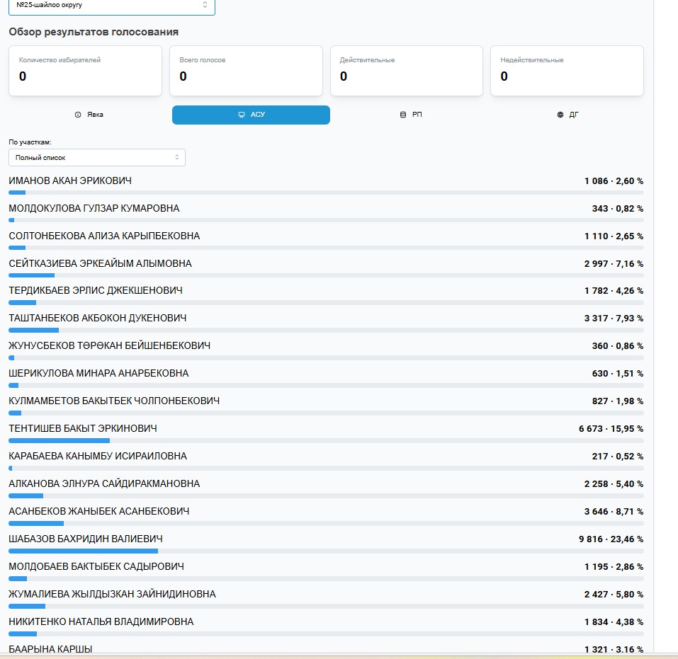 Шайлоодо кайсы талапкер канча добуш алды? (№16 округдан №30 округга чейин учурдагы көрсөткүч)