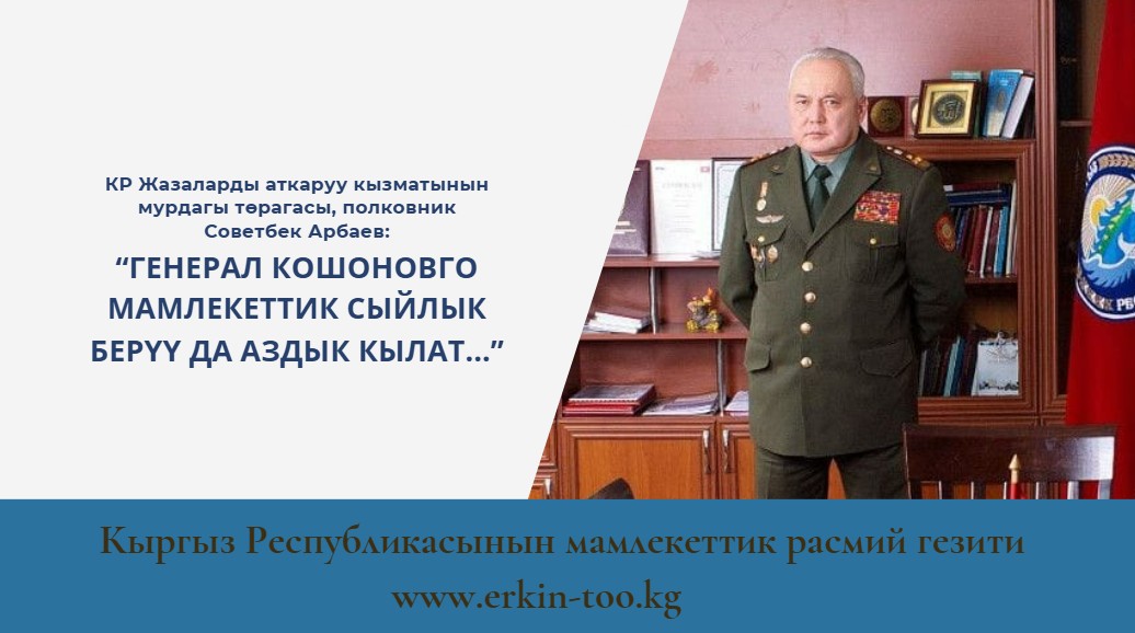— Ким кандай десе ошо десин, бирок, азыркыдай шартта мындай баатырлыкка тете ишти легендарлуу генерал-майор Кошонов Анарбек Айтышевич аркалоодо. Өзүң айткандай, каржылык жактан кыйын шарттарда азыркы жетишкендиктер үчүн СТКУнун борбордук кеңешинин төрагасы, генерал-майор Анарбек Айтышевичти эң жогорку мамлекеттик сыйлык менен сыйлоо да аздык кылат. Кайпактатпай, кептин түз маанисинде айтканда КРнын Спорттук, техникалык коргонуу уюмун барган сайын жаңы сапаттарга көтөрүп, заман талабынан калтырбай, кем-карчтарын толуктап, ар түрлүү спорттук оюндарды уюштуруп, аларга каржы булактарын таап берип, жумуштун ысык-суугуна чыдап, ийгиликтерди камсыздап жаткан Анарбек Айтышевичтин үзүрлүү эмгеги менен биздеги жетишкендиктер ишке ашууда. Мындай иш билги, караңгыда жол таба билген легендарлуу инсан турганда алдыда уюмдун бир кылымдык мааракеси эң жогорку деңгээлде өтөөрүнөн күмөн санабай деле койсок болот.
