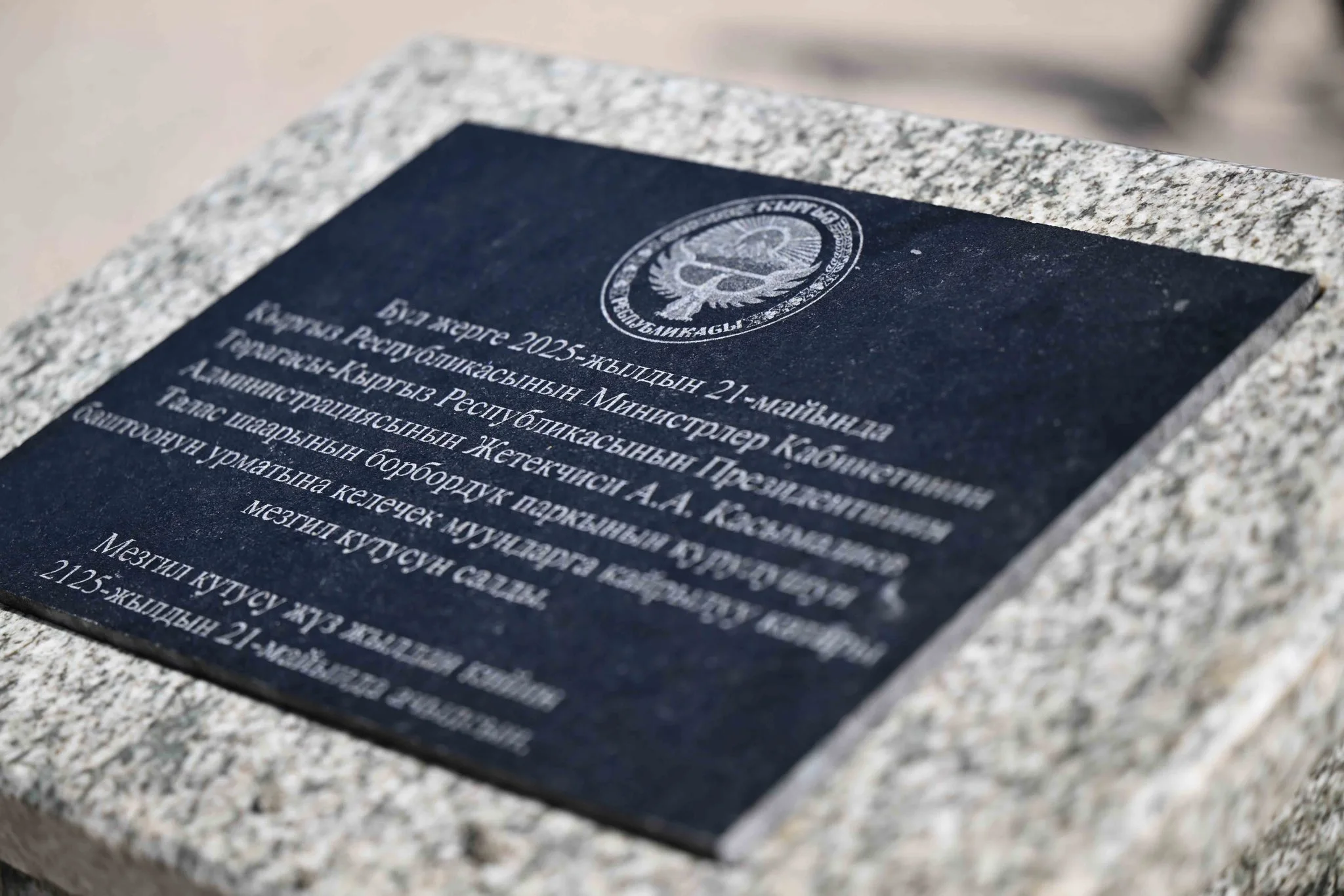 Бүгүн, 21-майда, Министрлер Кабинетинин Төрагасы Адылбек Касымалиев Талас шаарындагы борбордук парктын курулушуна мезгил кутусун салды. Бул тууралуу Кыргыз Өкмөтүнүн маалымат кызматы билдирди.