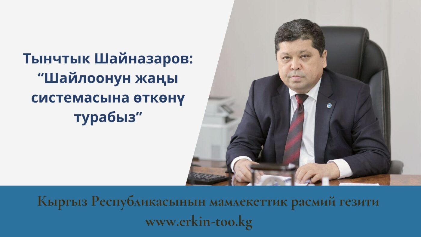 — Тынчтык Урайимович, жакында Президентибиз “Кыргыз Республикасынын Президентин жана Жогорку Кеңештин депутаттарын шайлоо жөнүндө” Конституциялык мыйзамга кол коюп, ал күчүнө кирди. Бул мыйзамда олуттуу жаңылыктар бар экен. Жаңы шайлоо системасы мурдагыдан айырмаланып, жаңы нукта өтөт деген пикирлер айтылууда. Сурайын дегеним, алдыда өтө турган шайлоонун системасы мурдагы шайлоолордон эмнеси менен айырмаланат? Анан ушул өзгөрүүлөргө шайлоо комиссиясынын кадрдык даярдыгы, техникалык мүмкүнчүлүктөрү жетиштүүбү?