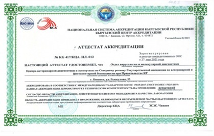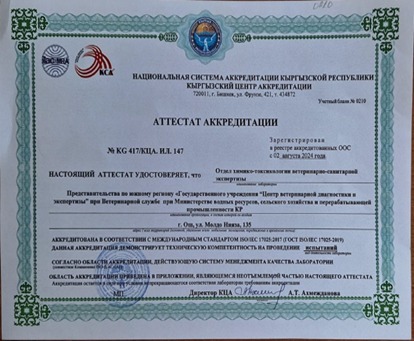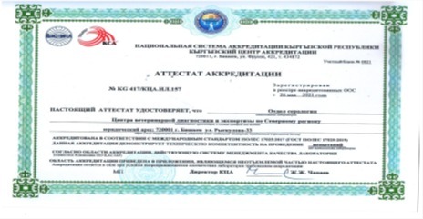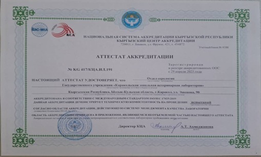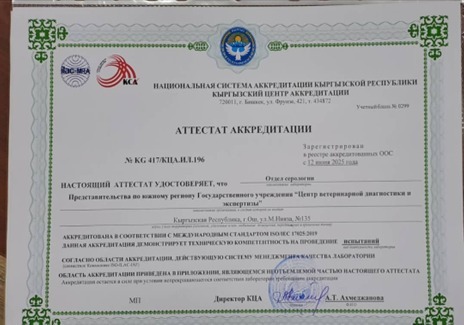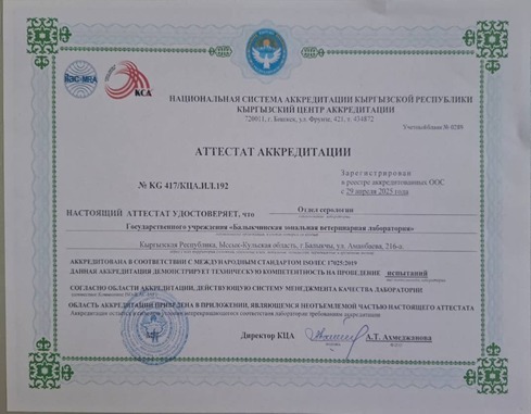 Аккредитация обласы: бруцеллез, хламидиоз, жылкынын учуну (случная болезнь), сап, жылкынын инфекциялык анемия ылаңдарына каршы антителолорду аныктоо.