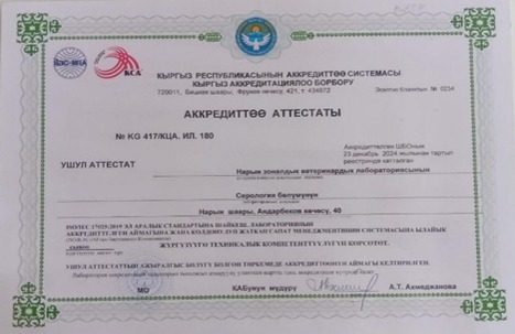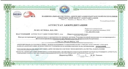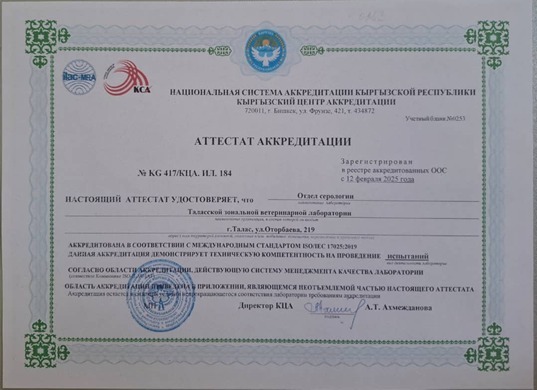 Аккредитация обласы: бруцеллез, эпидидимит, жылкынын учуну (случная болезнь), сап ылаңдарын аныктоо.
