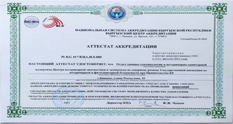 Аккредитация обласы: эт, сүт жана сүт азыктарынан, балык, жумуртка, балдан 70 жакын антибиотиктердин жана башка антимикробдук химиотерапевтикалык заттардын калдыктарын сапаттык ыкма менен аныктоо; уулу заттарды (кадмий, свинец, мышьяк), хлорорганикалык пестициддерди, чийки эт азыктарын идентификациалоо (кой, тоок, эчки, чочко, уй, жылкы, эшек, ит, мышык) жана химия-физикалык көрсөткүчтөрүн аныктоо.